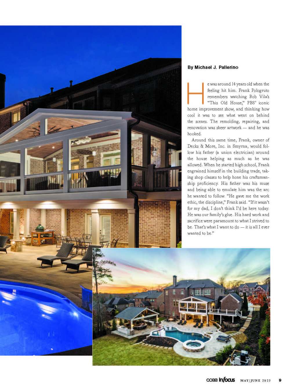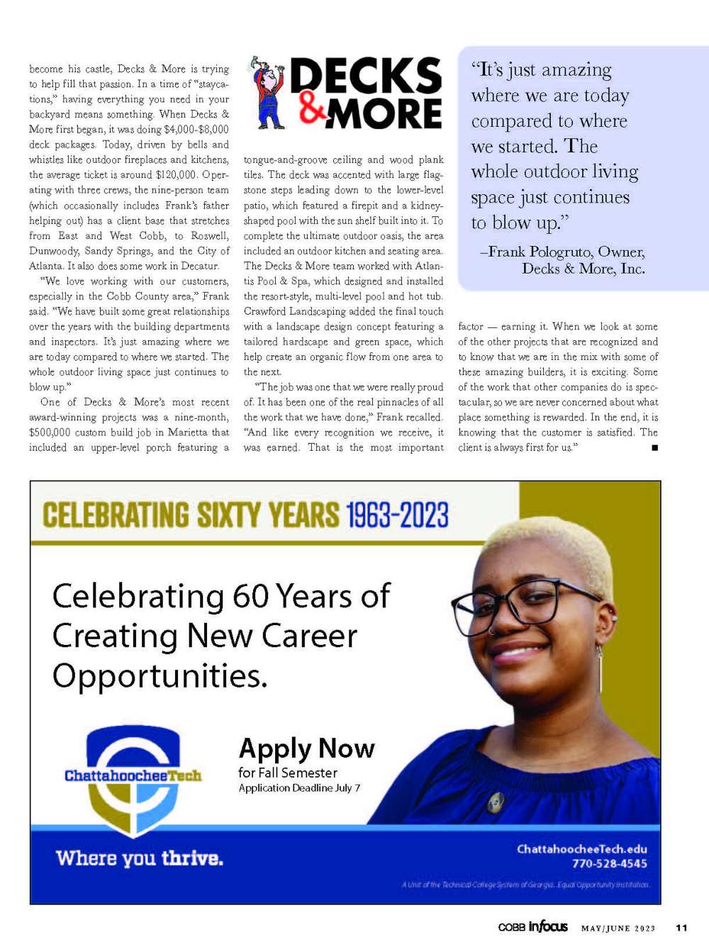 Decks & More is a featured deck builder in the latest edition of Cobb In Focus Magazine. “I am very excited to have this opportunity. In the article, I discuss how the business got started and lessons learned. But, the best part of this is being able to advise homeowners about how to approach a deck build or an outdoor living space improvement”, said Frank Pologruto, the owner of Decks & More. We hope you’ll pick up a copy of the magazine or read it here.